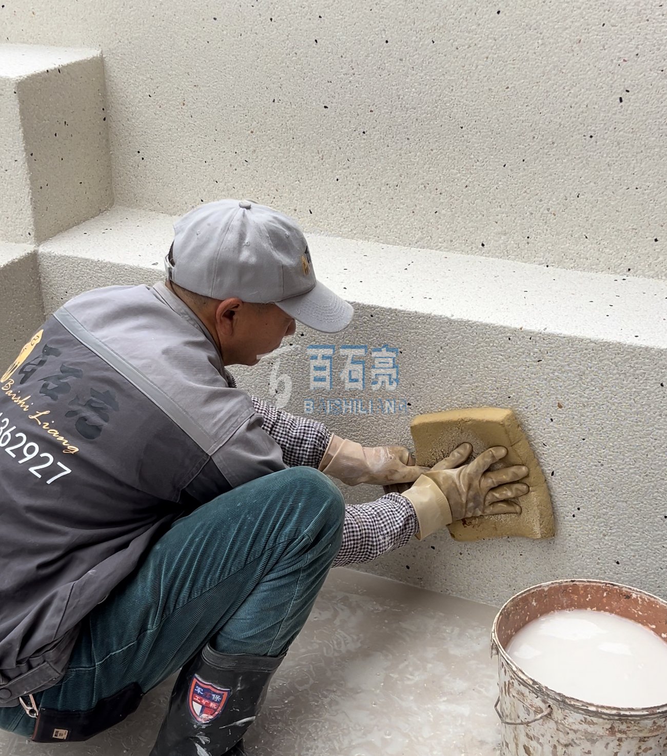 将搅拌好的材料摊铺在平面或者是立面上。摊铺要尽量保证水洗石平整度一致,摊铺立面的难度比平面的大很多,对师傅的技术有很大考验的。